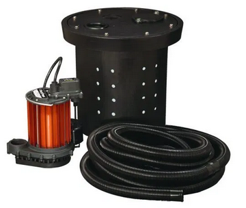 Unassembled sump pump kit features a compact perforated basin, sump pump and hose kit. Available with 237, 457 or 257 pump. Applications include crawl spaces, low lying areas around foundations or anywhere water may accumulate.