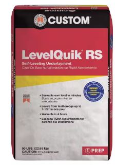 The Custom Building Products Leve lQuik RS 50 lb.Self-Leveling Underlayment is suitable for indoor and outdoor use. Can be applied to 1.5" thick in a single pour. Dries to walkable consistency in 4 hours. Prevents bond failure, crumbling and cracking in flooring like wood, tile, carpet or pergot.