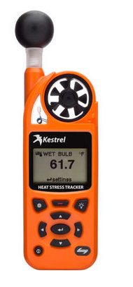 The Kestrel 5400 Heat Stress Tracker provides 15 measurements in all including temperature, altitude, barometric pressure, , dew point temperature, globe temperature, heat stress index, naturally aspirated wet bulb temperature, relative humidity, station pressure (absolute pressure), density altitude temperature, thermal work limit (TWL), wet bulb temperature (Psychrometric), wet bulb globe temperature (WBGT), wind chill, and wind speed. The Kestrel 5400 features a large, high contrast screen, dual color backlight, scratch- and breakage-resistant window, corrosion-resistant battery compartment with secure door, intuitive user-interface, plus it tracks and logs over 10,000 sets of time-stamped data. Data log can be transferred to a mobile device wirelessly, or to a PC/MAC with the optional waterproof USB Data Transfer Cable (sold separately). Combine the Kestrel 5400 with a portable vane mount and portable tripod (each sold separately) for a data-logging weather station that rotates in even the slightest breeze and is ideal for short-term monitoring.