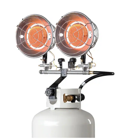 Mr. Heater Double Tank Top 30,000 BTU Radiant Propane Space Heater, dual burner with three adjustable heat settings. Burners can be used individually or combined. The area of warmth can also be adjusted to suit a solo garage repair or a group at a nighttime tailgate party.
