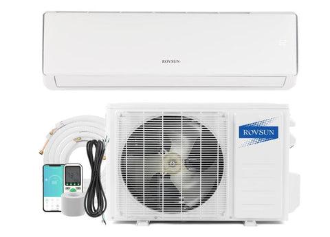 ROVSUN 11000 BTU Wifi Enabled Mini Split Air Conditioner & Heater, 17 SEER2 230V Inverter Ductless Wall AC Unit with Pre-Charged Condenser, Heat Pump & Installation Kit. This unit has a heat pump, air conditioner, fan and dehumidifier. Enabled with Wi-Fi and remote control. Featuring ultra-quiet operation .