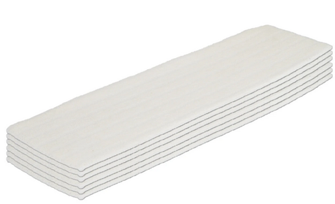 Microfiber Wholesale's Disposable Microfiber Mop Pad is the first of its kind. It’s a 19” long pad which will work with out 16” and 18” Microfiber Mop Frames. This low cost pad is durable enough to be laundered a 6-12 times, but inexpensive enough to be tossed out. The lint free mop pad is constructed from tufted polyester / polyamide blend microfiber yarn and polyester yarn. The extra polyester is added to help the mop glide across the floor; too much microfiber would make it next to impossible to push across the floor. The microfiber / polyester face yarn is sewn to a hook and loop style backing with overlock stitching on the edges. Between the microfiber face yarn and the hook and loop style backing is a thin foam core. The purpose of the foam core is to help the microfiber mop pad keep its shape throughout the life of the pad and to store liquids (water, disinfectant, cleaner) which will help emulsify dust, dirt and grease for effective cleaning.