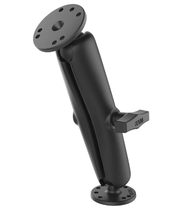 The  RAM Mounts Double Ball Mount with 2 Round Plates, a versatile drill down solution. Comes with two round ball bases and C size long length double socket arm. Many adjustable options.  Marine grade aluminum with powder coating keeps it's shape even in demanding environments.
