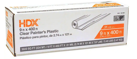 Keep paint spills and drips off the floor with the HDX 9 ft. x 400 ft. 0.31 mil High-Density Plastic Painters Sheeting. Made with high-density clear polyethylene for reliable protection and unobstructed visibility. Thanks to its excellent tape adhesion, this lightweight sheet can be used as a paint drape, overspray shield, or multi-purpose cover.- Offers protection against accidental paint drips and spills