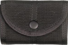 Ballistic nylon design. Black snap closure 4" wide and 3" high. Fits horizontally on 2-1/4" duty belt.