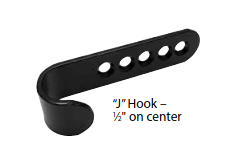 The J-Hooks for Track Mounting Systems #20-JH115-B has hole spacing on the following J hooks and is 1⁄2" on center.1⁄8" x 1" mild steel with black epoxy coating. Works with track mounting systemsOther fine products