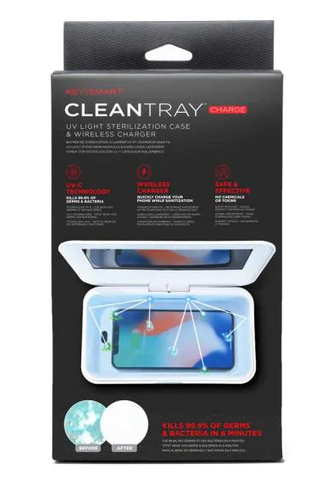 The CleanTray Charge is a UV light sterilization case that disinfects your phone in just 5-minutes while it charges. The UV rays safely kill 99.99% of germs and bacteria. CleanTray is the all-in-1 solution to STORE, CLEAN and CHARGE your phone, wallet and keys. You can also use the CleanTray to disinfect your other daily items such as airpods, knives, jewelry, sunglasses, pacifiers and more. Works with all Qi enabled wireless charging devices.- Kills 99.9% of germs and bacteria in 5-minutes, 2 x faster than other leading UV cases