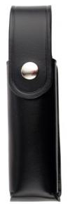 Plain leather design. Fits most 4 oz  MKIV Mace/OC canisters. 6" tall, 4-1/2" round. Fits up to 2-1/4" belt.