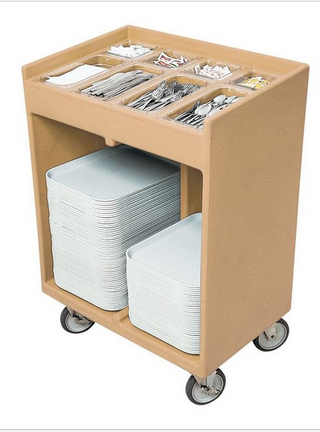 The Cambro TC1418157 Coffee Beige Tray and Silverware Cart provides an open storage compartment below the cutlery rack that can hold up to (200) 14" x 18" trays, plates, or other items needed for service, while the (4) 1/3 size food pans can hold up to 100 knives, 100 spoons, or 80 forks, and the 1/6 size food pans are perfect for holding a variety of condiments. This cart ships fully assembled so that no complicated setup or assembly is required.