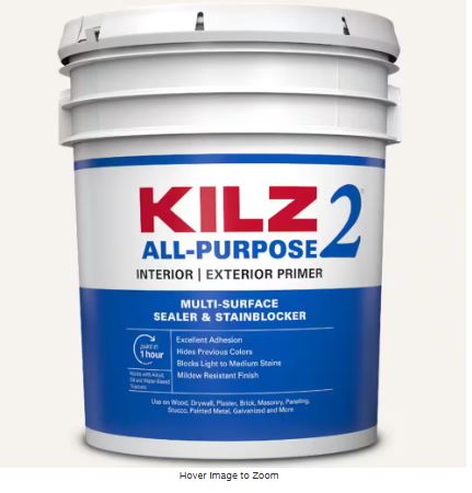 The KILZ 2 ALL PURPOSE 5 Gal. White Interior/Exterior Multi-Surface Primer, Sealer, and Stain Blocker blocks light to medium, mold, mildew and rust stains. Can be applied to indoor and outdoor surfaces like drywall, brick and masonry. Crafted for walls, ceilings and door projects. Seals new drywall and prevents cracking.