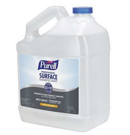 Purell 4342-04 1 Gallon / 128 oz. Fresh Citrus Professional Surface Disinfectant is the perfect way to keep restrooms, cafe's, waiting rooms, office cubicles, and anywhere viruses and bacteria may collect clean. Ethyl Alcohol is the active ingredient killing : E. Coli, Hepatitis A, Hepatitis B, HIV Type 1, Influenza A Virus, Methicillin-Resistant Staphylococcus Aureus, Mycobacterium Tuberculosis, Norovirus, Salmonella, Staph Infection, and Vancomycin-Resistant Enterococcus Faecalis.