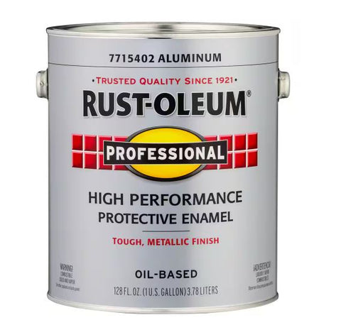 The Rust-Oleum Professional 1 gal. High Performance Protective Enamel Gloss Aluminum Oil-Based Interior/Exterior Paint. Made to resist rust, abrasion, and tough environments. Ideal for surfaces that tend to corrode. In case of spills, cleans up with mineral spirits. Covers up to 400 sq ft.